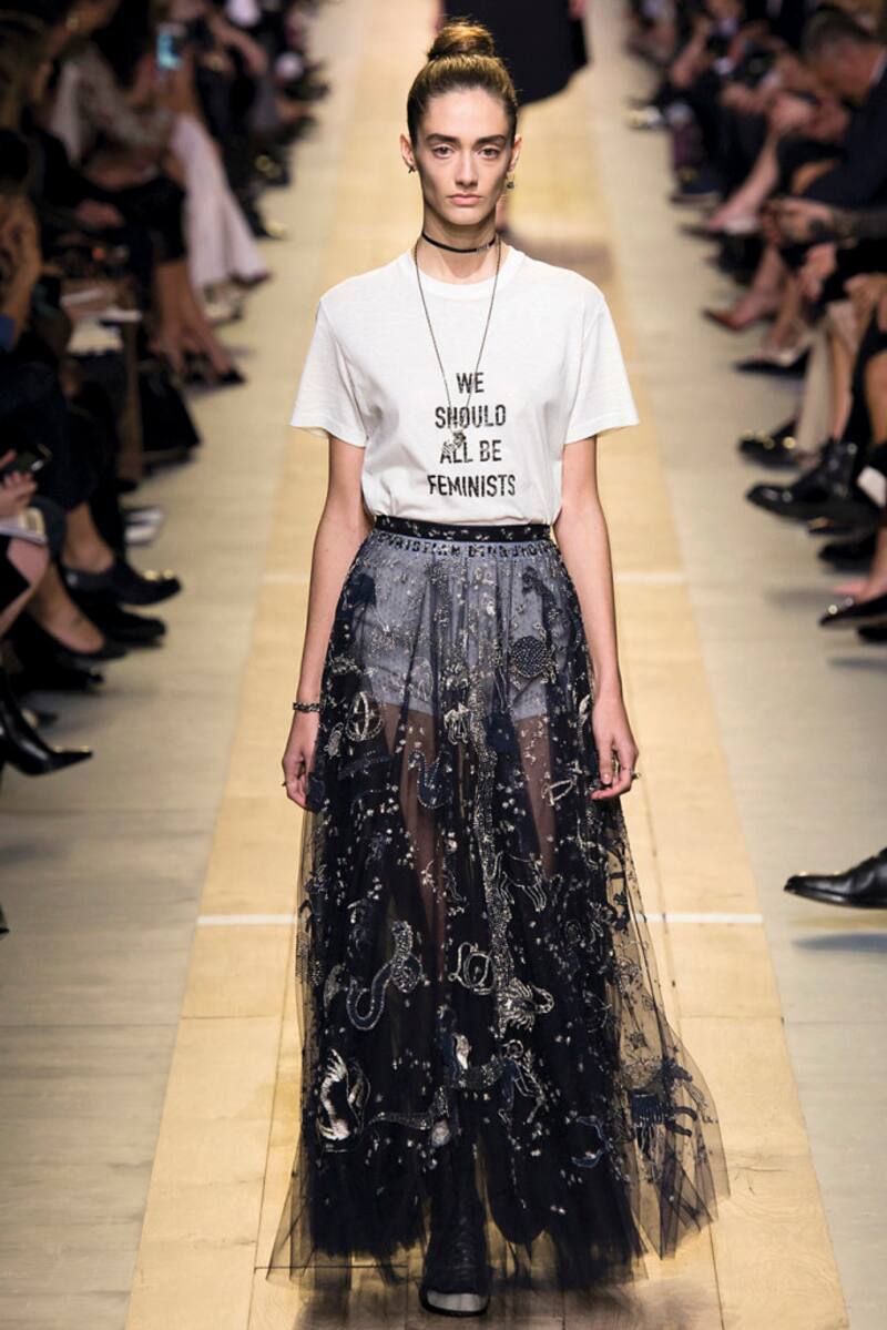 5. Feminista: en su primera colección prêt-à-porter para Dior, que mostró en septiembre en el Museo Rodin, partió con looks inspirados en el esgrima: chaquetas de tejidos acolchonados y correas laterales, cuellos cisne y pantalones ajustados por encima de la rodilla. "En el deporte no se hacen distinciones de género, porque es la misma ropa para hombres y para mujeres. Quería reproducir este elemento en la moda", explicó. Pero el momento más instagrameado y tuiteado fue cuando aparecieron las poleras (foto) con mensaje #Weshouldallbefemenist (Todos deberíamos ser feministas), combinadas con polleras de tul y zapatillas.