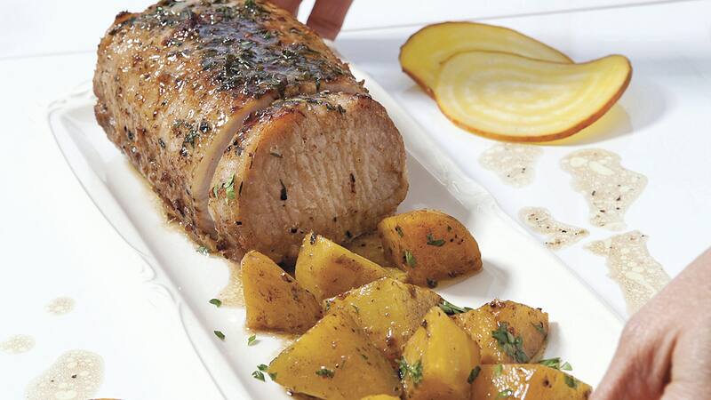 4. En una fuente extendida colocar el lomo de cerdo y acompañar con los nabos o betarragas acarameladas. Servir espolvoreado con perejil.