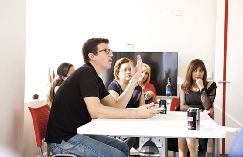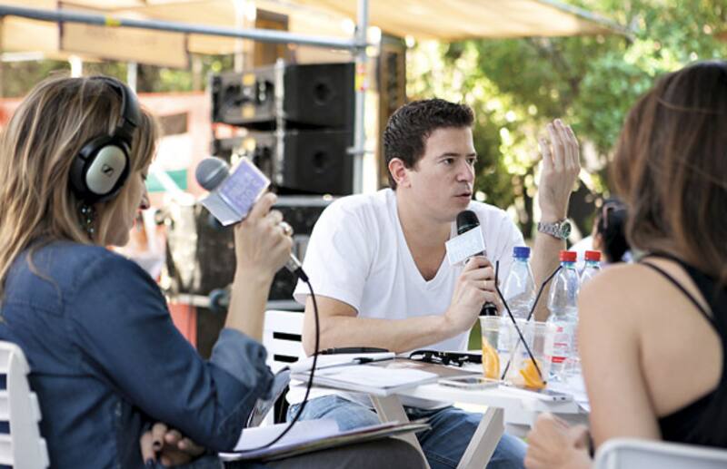 Arriba, Piqueras conversa con dueños de restoranes peruanos en Chile en la Oficina Comercial de Perú en Santiago. Abajo, en un programa en Radio Paula.