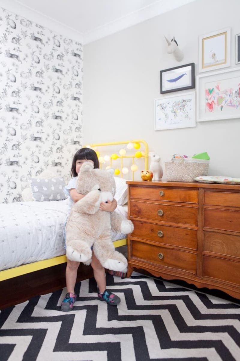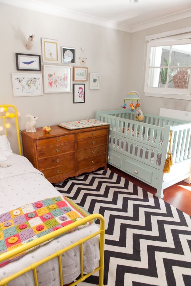 Y en el dormitorio de sus hijas: Candelaria y Hortensia, hay un tragaluz que ilumina la pieza, principalmente el rincón de lectura. La cama de Candelaria es de la tienda Kudun y la piecera fue tejida por su abuela.