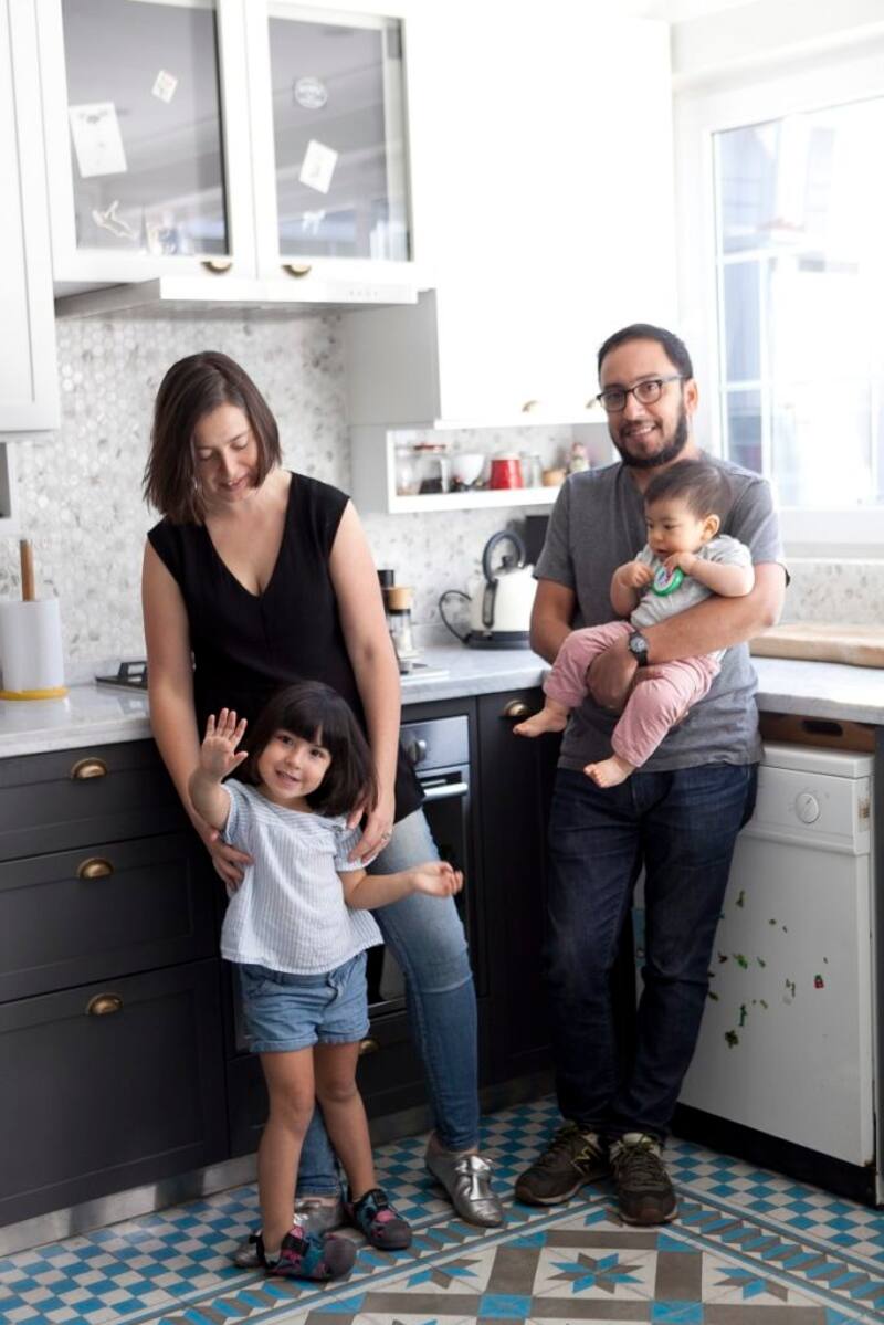 Cuando uno entra, la atracción principal es la cocina: amplia y con mucha luz. "Pasamos gran parte del día aquí. Nos gusta cocinar en familia o con amigos", dicen. La cocina cuenta con una gran mesa de madera natural que se mueve gracias a unas ruedas; tiene baldosas Cóndor diseñadas por ellos, mármol en las mesa de los muebles de cocina y un gran lavaplatos que Valentina compró en Ikea y que una amiga le envío a Chile.