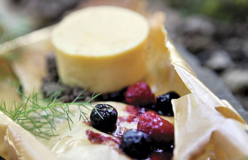 forrar con papel aluminio. Cocinar en un horno a baño maría a temperatura baja, 40 minutos o hasta cuajar. Retirar del horno, dejar enfriar y servir decorado con berries.