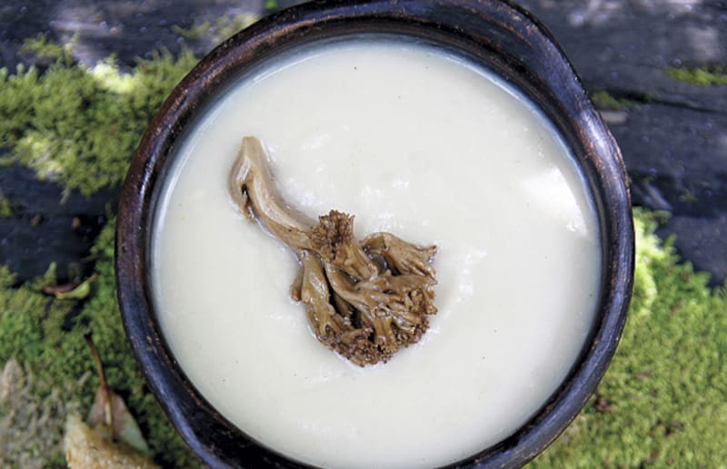 4. En pocillos individuales distribuir la crema de ajo, decorar con los changles y servir de inmediato acompañado de catutos.
