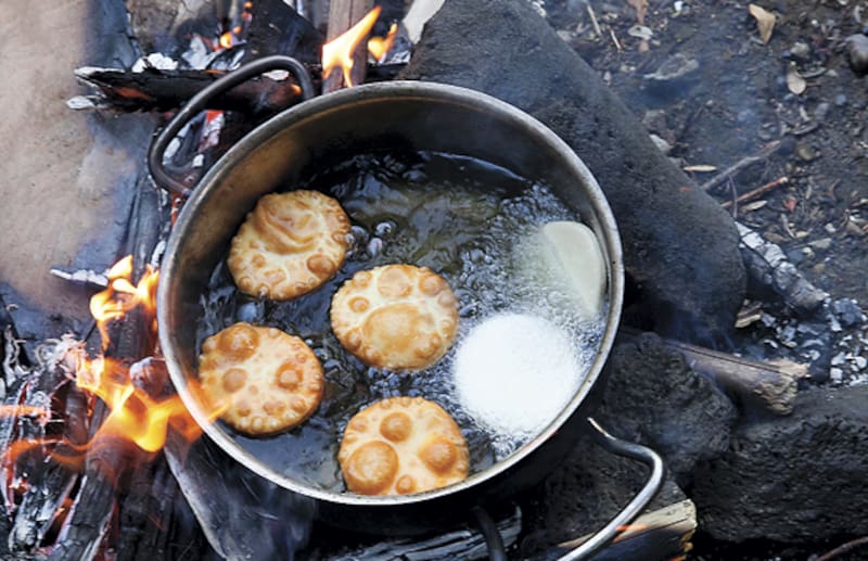3. En un mortero moler el trigo mote y sazonar con sal y merquén. Con las manos formar los catutos. En una olla calentar aceite a fuego medio hasta que esté caliente, agregar los catutos, de a pocas cantidades, y freír hasta dorar por ambos lados. Con una espumadera retirar los catutos, estilar en papel absorbente.
