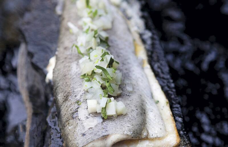 3. Calentar piedras grandes o una plancha, pincelar con aceite y espolvorear con sal de mar. Encima colocar las truchas y volver a espolvorear con sal, cocinar 3 minutos o hasta el punto de cocción deseado, sin dar vuelta.