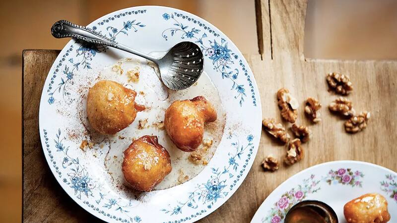 4. En platos individuales colocar los loukoumades y encima verter un poco de almíbar. Servir espolvoreados con nueces y canela.