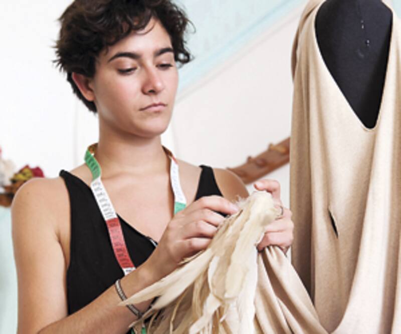 Lupe Gajardo confeccionando un vestido hecho con plumas traídas de Nueva York.