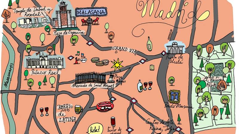 Pero entremedio de Gran Vía y Plaza España, está el barrio de Malasaña, epicentro de la vida nocturna y del arte urbano. Ahora, para ser honestos, Malasaña es un ex barrio de abuelitos que disfrutaban el café matutino en el bar de la esquina, y que hoy conviven con un sinfín de hipsters que han hecho del lugar el "it place" de Madrid. A su vez han repletado las calles de bicicletas y subido los decibeles de las calles. Si bien suena caótico, Malasaña es encantador ya que hace que esos dos mundos convivan. Se siente el respeto y la sensación de comunidad. Imperdible en una noche en Madrid es partir a la plaza del Espíritu Santo en Malasaña e irse de copas, o comer algo en el pintoresco restorán Ojalá, que por módicos precios es una excelente experiencia entre pisos de arena.