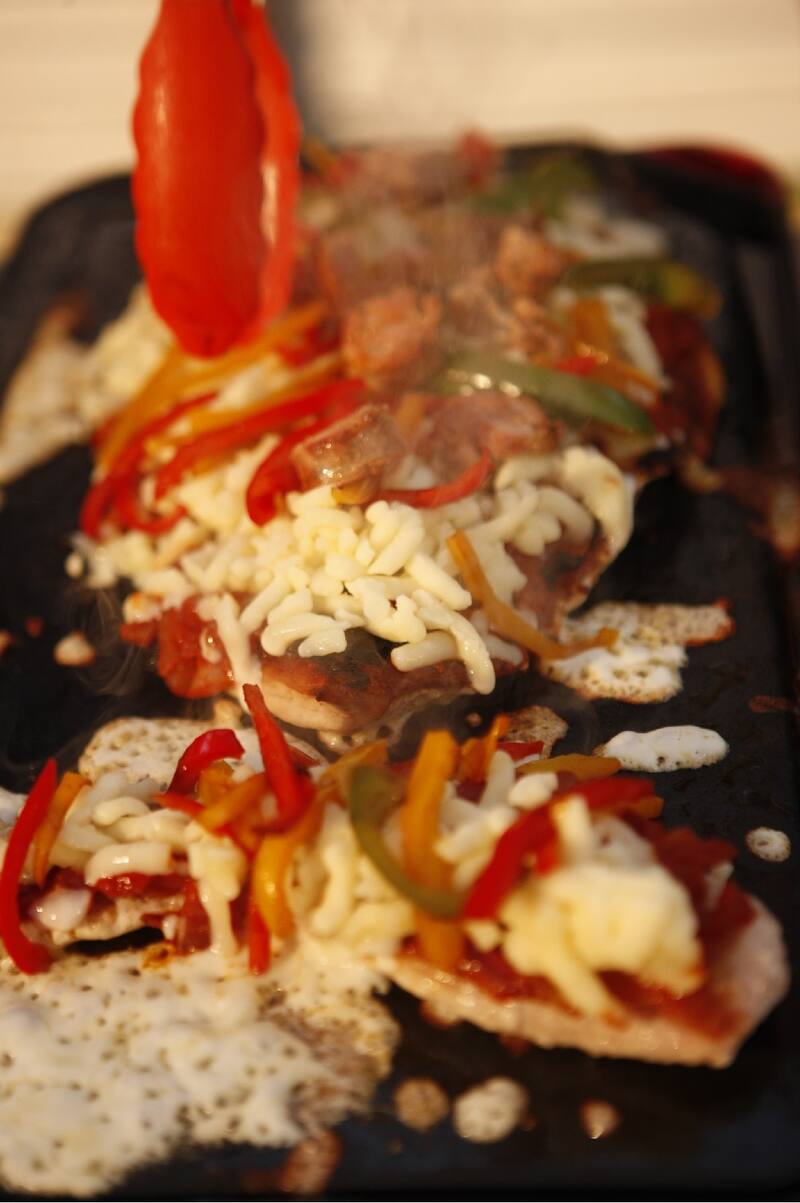 5. Antes de que se empiece a derretir el queso, añadir mezcla de pimentones verdes y amarillos cortados en tiras, previamente puestos en sartén con aceite de oliva.