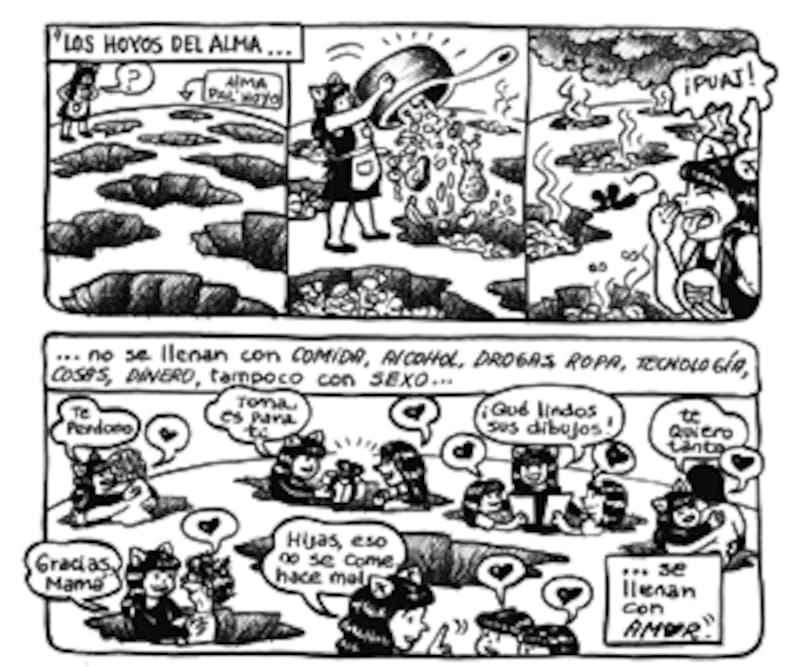 "Los hoyos del alma no se llenan con comida, alcohol, drogas, ropa, tecnología, cosas, dinero. tampoco con sexo… se llenan con amor y, sobre todo, con amor a uno mismo", se lee en una viñeta ilustrada, donde se ve un planeta poblado de cráteres y un letrerito que dice: "alma pa'l hoyo".
