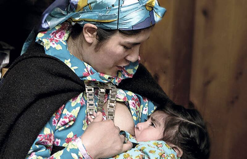 La Araucanía es la región con mayor prevalencia de lactancia materna hasta el sexto mes de vida de los hijos; alcanza un 57,2% en las madres que se controlan en el sistema público, mientras el promedio nacional es de un 44,7%, según cifras del Ministerio de Salud. "Todos los meses realizamos talleres y charlas para empoderar a las madres, defender la lactancia libre y enseñar que amamantando se cambia el mundo, porque el resultado son niños más inteligentes, seguros y sanos", dice Katterina Vergara (32), activista por la lactancia de La Araucanía y creadora de la ONG Trawün Domo (que quiere decir reunión de mujeres), con la que realiza un trabajo comunitario para la promoción de la lactancia. Esta labor también la lidera la enfermera Erika Sandoval, quien desde 2009 coordina la Comisión Regional de la Lactancia de La Araucanía y lucha por posicionar este tema como estrategia prioritaria de la salud pública de la región: "Ser los primeros del ranking de lactancia materna se lo debemos, también, a la cultura mapuche, quienes históricamente la han valorado como sistema de apego y comunicación entre la madre y la guagua", señala. Juana Quiriban, en la foto, es madre de Rayén de 1 año y 5 meses, vive en la comuna de Padre Las Casas, desde donde viaja junto a otras mujeres mapuches para colaborar en talleres de prolongación de periodos de lactancia.