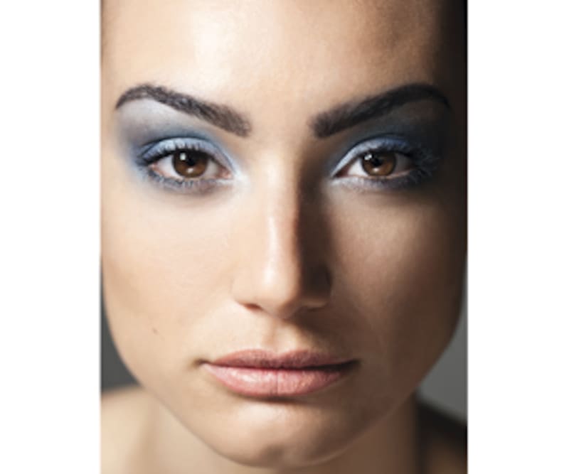 Con la sombra azul marina y una brocha de pelos definidios y cortos difuminó y maquilló el pliegue del párpado. Finalmente, sin cambiar la brocha, pero ahora con una sombra plateada (para iluminar), marcó el arco inferior de las cejas y la esquina interna del ojo.