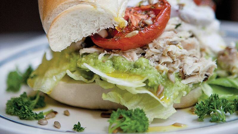 3. En las mitades de pan distribuir la mezcla de sierra, encima la mezcla de apio-palta y hojas de rúcula. Luego tapar con las otras mitades de pan y servir de inmediato acompañados de ají.