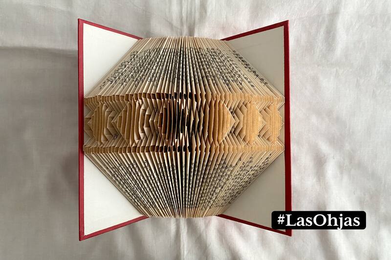Reutilizar libros que son leídos y luego quedan olvidados en los estantes fue lo que motivó a la gestora cultural Francesca Latoja a fundar, en 2018, el proyecto Las Ohjas, que consiste en crear libros-objeto-escultura, jugando con las formas geométricas que se generan a partir de los pliegues de sus páginas. “En mi casa siempre había libros en cajas, en bodegas, en el entretecho, en un montón de lugares donde simplemente ocupaban espacio. Me di cuenta de que no me alcanzaba la vida para leer todos los que tenía a disposición, entonces empecé a buscar qué hacer con ellos, y así llegué a este mundo de los libros plegados o book folding”, cuenta.