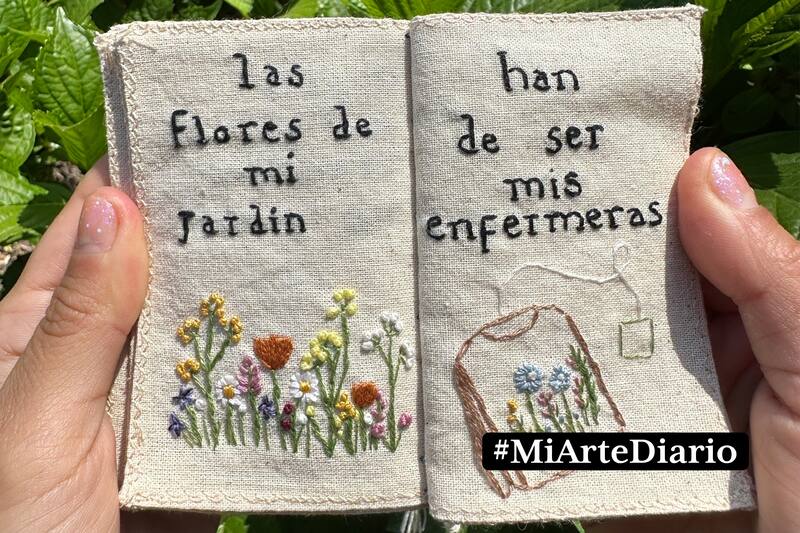 Con un poco de vergüenza, en plena pandemia Carol Cuadra se animó a compartir su trabajo a través de Instagram. Había dejado sus estudios universitarios y comenzó a explorar actividades, manualidades y oficios. “Debido a que no me encasillaba en un solo tipo de arte, se me ocurrió la idea del nombre Mi Arte Diario, ya que el arte se presenta en todo y diariamente, en actividades como cocinar, maquillar, escribir, pintar, bordar, dibujar, fotografiar, etcétera”, dice Carol, quien se ha enfocado principalmente en las prácticas de bordado y encuadernación. Fue la combinación de esas dos pasiones, junto con el gusto por las palabras, la poesía y la música, lo que la llevó a elaborar sus pequeños libros bordados.