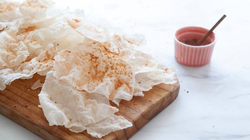 Poner las hojas de papel de arroz en el microondas entre 1 a 5 minutos a máxima potencia, hasta que queden crocantes e infladas. También se pueden freír con aceite de maravilla por 2 minutos. Servir el papel crocante y condimentar con los aliños.