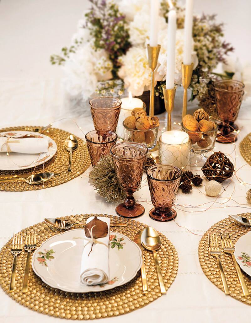 Juego de cubiertos para 6 personas dorados, Basement, $ 49.990. Individuales dorados de 38 cm, hechos a mano, Roberta Allen, $12.990 c/u. Disponibles en Falabella.