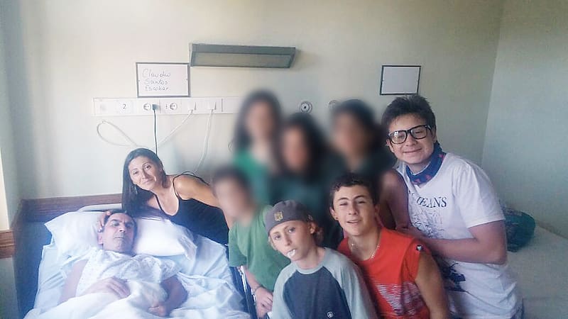 "Nicolás solía compartir con las niñas del Hogar Betania y con los abuelitos del Hogar San José. Los hacía reír y les hacía masajitos en las manos. No sé cuántos jóvenes hacen eso, él tenía una nobleza inusual", dice Heidi, en la foto junto a sus hijos y Nicolás (con anteojos) visitando a Claudio Santos, paciente del Hospital de Pucón. "Cuando lo íbamos a ver, poníamos música y bailábamos alrededor de él", cuenta.[/caption]