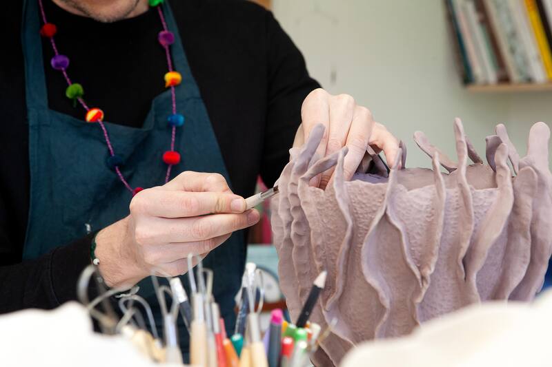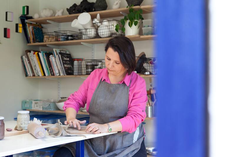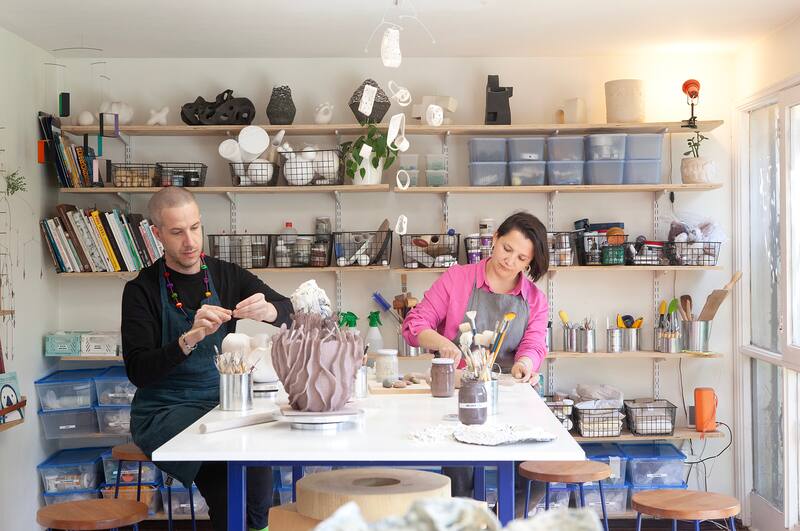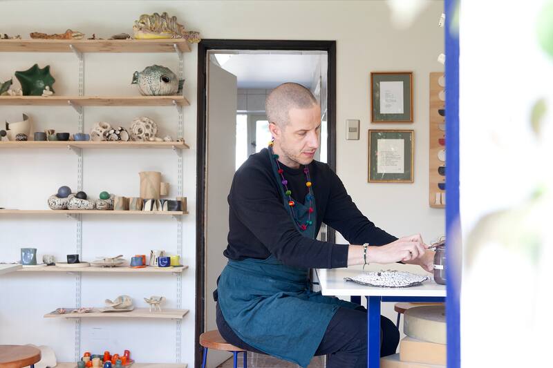 Actualmente Gabriela y Martín hacen clases todas las semanas tanto a alumnos con experiencia como a aquellos que parten de cero, que no han tenido ningún acercamiento a la cerámica. “Las clases son personalizadas. Siempre estamos la Gaby y yo, y pese a que cada alumno trabaja a su ritmo su proyecto personal, vamos guiamos el proceso, ofreciendo soluciones técnicas y estéticas. Espacio Azul propone una forma diferente de hacer cerámica, no es el típico taller en el que se hacen solo cosas utilitarias, rústicas y decorativas. Nos gusta explorar las formas delicadas y visualmente ligeras. Tenemos alumnos que desarrollan proyectos más ambiciosos y que muchas veces venden o exponen”, cuenta Martín.