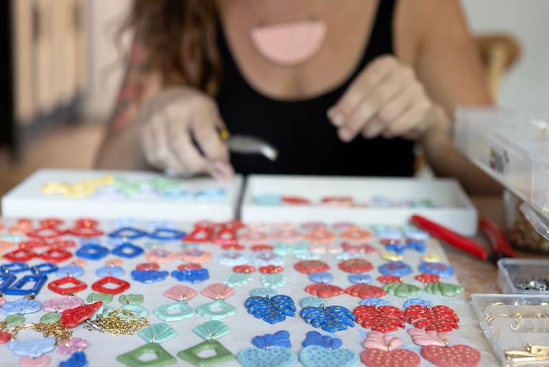 Actualmente, su catálogo incluye colecciones pequeñas de aros, collares y anillos, todas agrupadas bajo un concepto que las definen. Cada pieza está hecha a mano, una por una. Como máximo, realiza dos piezas iguales, aunque la mayoría son únicas. Trabaja con cerámica de baja temperatura y dos quemas, y asegura estar completamente maravillada y enamorada de este nuevo camino.