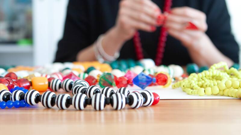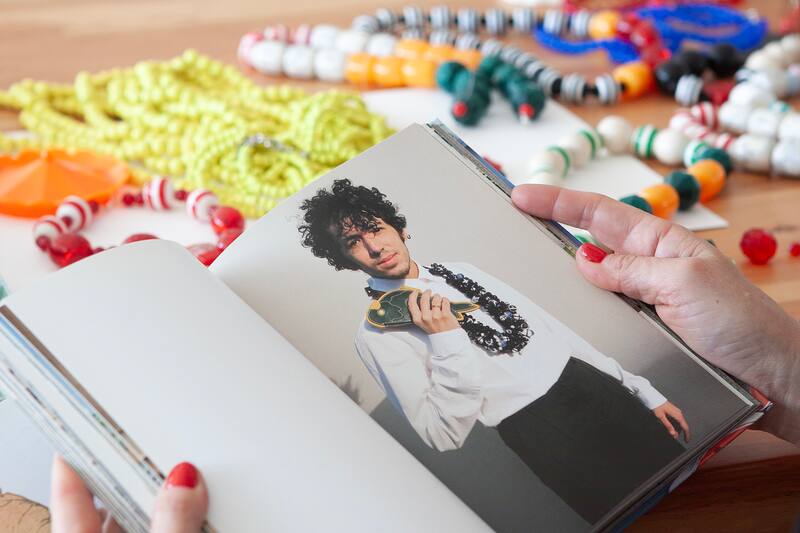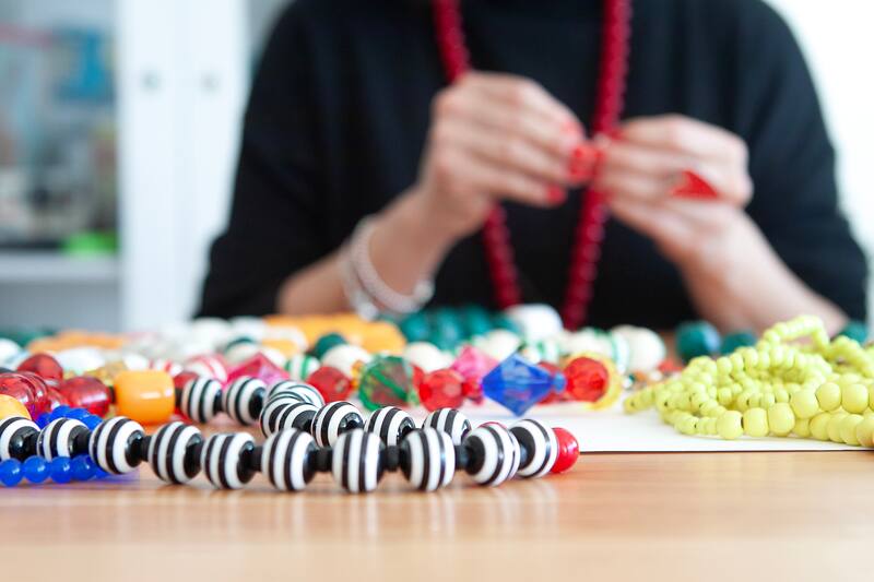 Las joyas que ha comenzado a confeccionar a sus 44 años no son de cerámica en frío, sino de piedras de todo tipo de materiales, formas y colores. Son collares inspirados en el estilismo de la década del 60 y 70, épocas de revolución cultural marcada por la libertad de expresión y la experimentación con formas y colores.