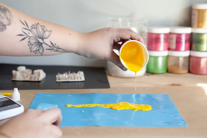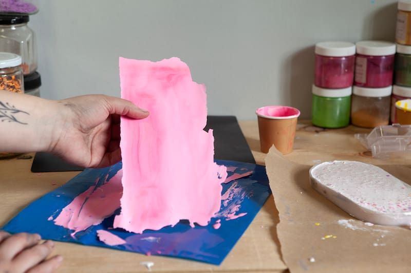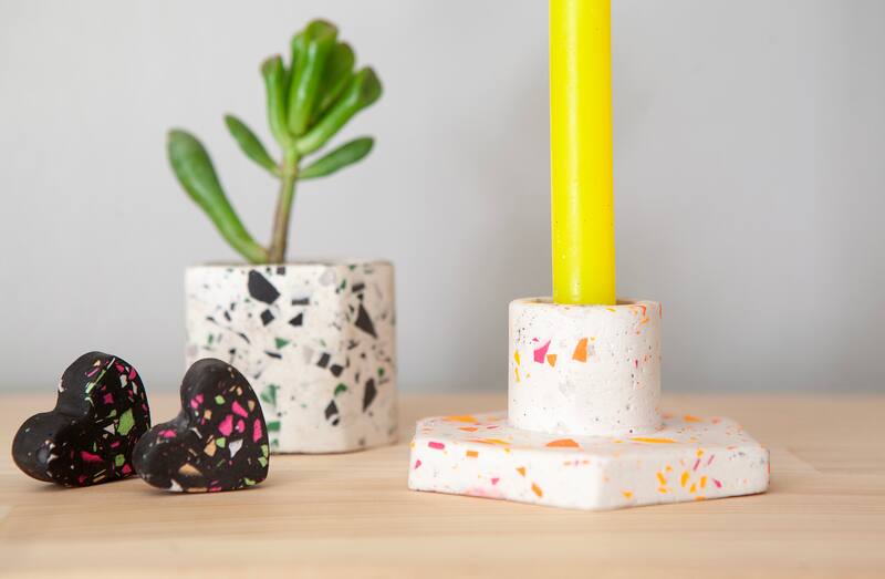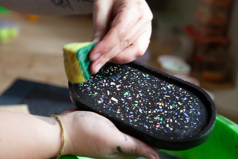 Actualmente ofrece un taller de Terrazo con ecoresina acrílica que –según dice– tiene varias cualidades que lo hacen único. “Primero es un material biodegradable y muy amigable con el medio ambiente, lo que lo diferencia de las otras resinas. Es un proceso limpio, a base de agua, que se puede trabajar en ambientes cerrados sin ningún problema. Y creo que una de las cosas más lindas, es que es un proceso seguro; el resultado está garantizado, no puede salir mal, y eso es muy importante para calmar la ansiedad, construye confianza en una misma, y puede ayudarnos a encontrar un poco de tranquilidad”, afirma.