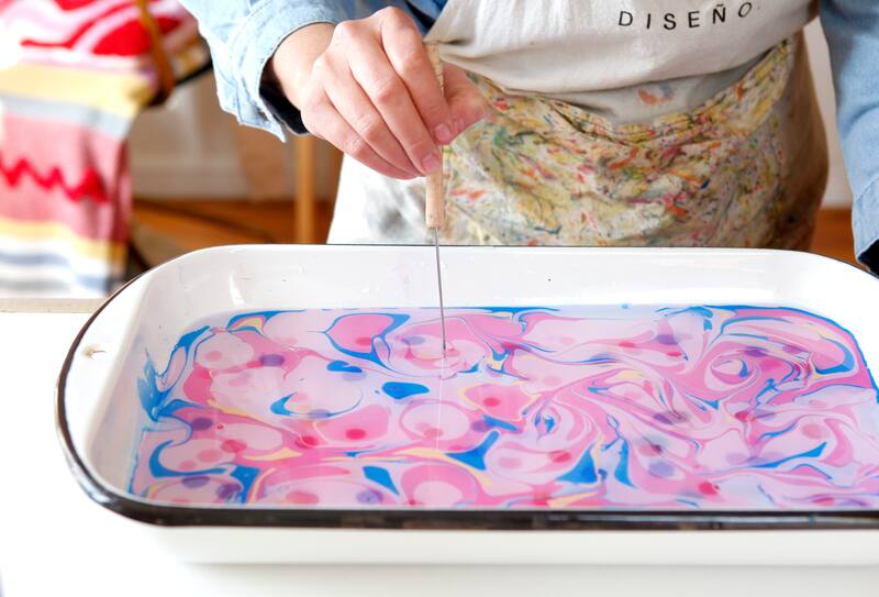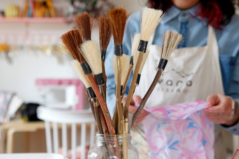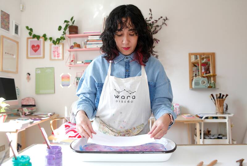 Wara Diseño es un taller/estudio donde se experimenta con la técnica del marmolado, que es básicamente pintar sobre el agua y luego traspasarlo al textil, papel o madera. Ahí estampan sus propios diseños y luego desarrollan productos atemporales, zero waste y únicos ya que es esa una de las principales características de la técnica. Instagram: @wara.diseno