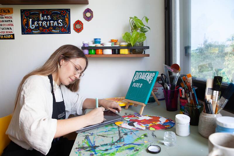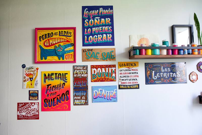 Fernanda Lara es profesora de profesión, pero su oficio es el rotulado a pincel. Desde el 2020 en su proyecto 'Las letritas' (@las.letritas_), plasma frases de la cultura chilena y de canciones clásicas en letreros hechos completamente a mano y a puro pulso, rescatando técnicas de gráfica popular. Ha participado en mercados y también realiza trabajos personalizados. Aquí, parte de su trabajo.