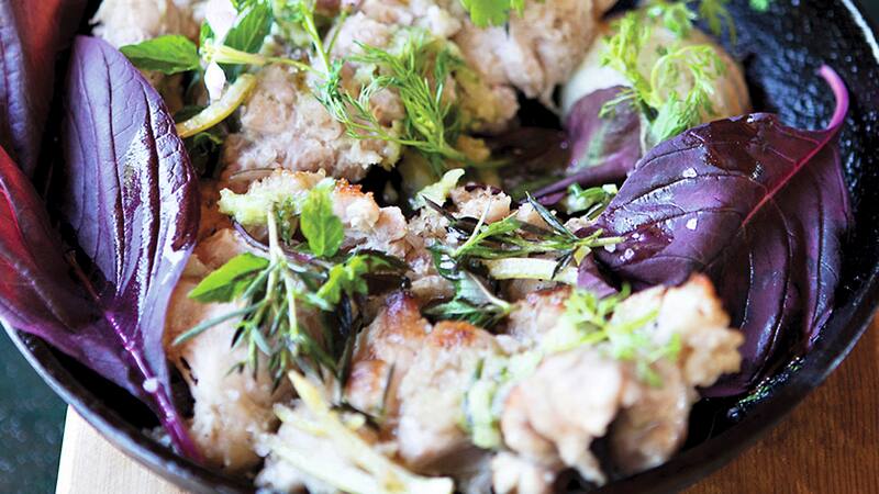3. En brasas de carbón o leña colocar un sartén de fierro (que sea resistente al calor). Una vez caliente, añadir la mantequilla, aceite, ajo negro e incorporar las mollejas. Cocinar por ambos lados hasta dorar. Verter la chicha, caldo de cocción reservado y sazonar con sal, pimienta de canelo y merquén, seguir cocinando hasta evaporar el alcohol de la chicha, corregir la sazón. Servir con las chalotas asadas, hojas frescas y gotas de limón.
