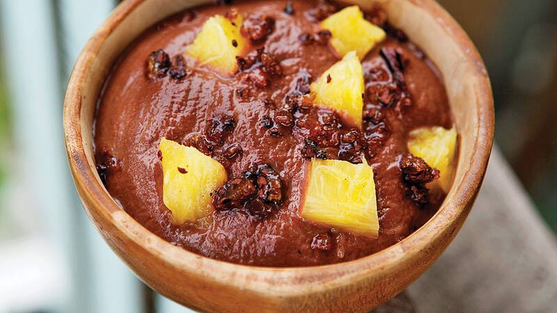 4. En pocillos individuales distribuir al fondo el caramelo de maracuyá, luego la mousse de chocolate reservada y encima los trozos de piña asada. Servir de inmediato.•