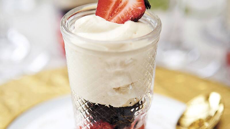2. En vasos individuales colocar 1 cucharada de frutillas picadas, luego distribuir las galletas y encima la mousse reservada; refrigerar. Al momento de servir decorar con las frutillas en mitades.