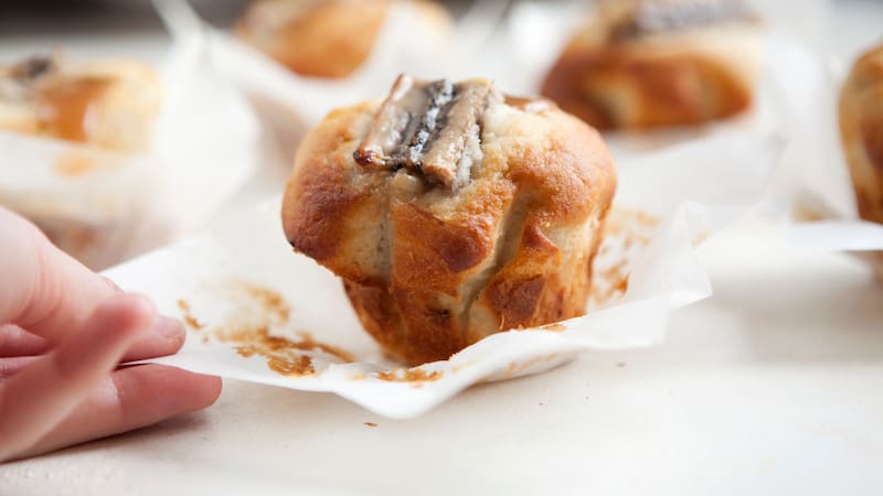 6. Decorar cada muffin con un trozo de plátano cortado a la mitad.