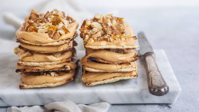 Para armar, poner una galleta Salma, esparcir una capa delgada de manjar, luego la crema de manjar y praliné. Cubrir con otra galleta. Repetir hasta amontonar tres galletas. Hacer lo mismo con el resto de las galletas hasta formar cinco napoleones y terminar decorando con praliné. Mantener refrigerado hasta el momento de servir.