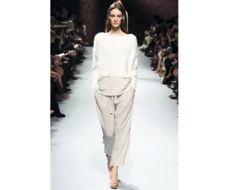 Inspirado en los códigos y elementos de decoración interior, como alfombras y cortinas, Copping mostró 48 looks conformados por vestidos, polleras, pantalones y abrigos. Llamó la atención que la mayoría de las piezas se situaran en el denominado estilo homewear (ropa cómoda que se usa en casa), pero desplegadas con elegancia, como unos pantalones anchos, estilo pijama, hechos de cachemira (en la foto de pasarela).