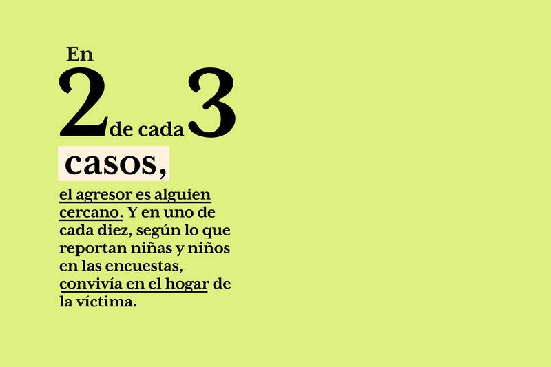 El informe confirma aspectos dolorosos, pero urgentes de ver, a nivel de la sociedad: la violencia sexual -que consiste en actos de connotación sexual no consentidos, con o sin contacto físico y que pueden ocurrir mediante fuerza, manipulación o aprovechamiento de una relación de poder- ocurre principalmente en los lugares que deberían ser seguros. En dos de cada tres casos, el agresor es alguien cercano. Y en uno de cada diez, según lo que reportan niñas y niños en las encuestas, convivía en el hogar de la víctima. “La violencia lamentablemente se presenta en espacios que deberían ser seguros para niñas y niños, entre ellos, sus hogares. Eso tiene que cambiar”, explica Del Villar.