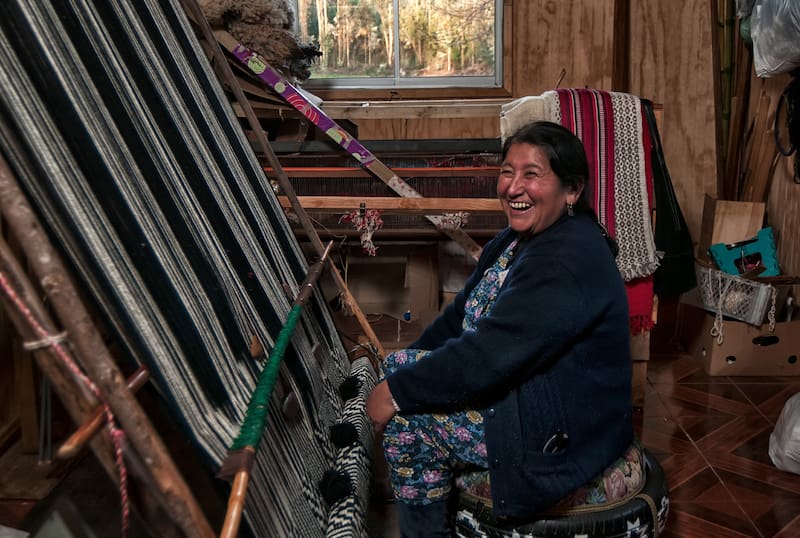Sentada en un neumático montado sobre 4 ruedas, con un cojín en el centro y orlado de grecas blancas, Aurora Huenchuñir Millaqueo, casada, tres hijas, se desplaza por su temperado taller. El asiento móvil es un ingenio que ideó Jorge, el marido de su hija menor, y se lo trajo de regalo hace un tiempo. “Es muy habiloso, mi yerno. Tiene arte”, cuenta, orgullosa. Y agrega: “Es complicada la posición en que se trabaja el tejido. Antes me daba lumbago todo el tiempo, y dolor de hombros, pero esta sillita con ruedas ha sido una bendición. Me facilita mucho el trabajo”.
