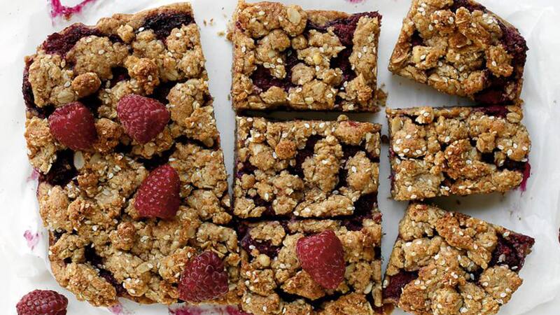 7. Hornear por 30 minutos o hasta que la fruta esté cocinada y la masa levemente dorada. Dejar enfriar y cortar en cuadritos.