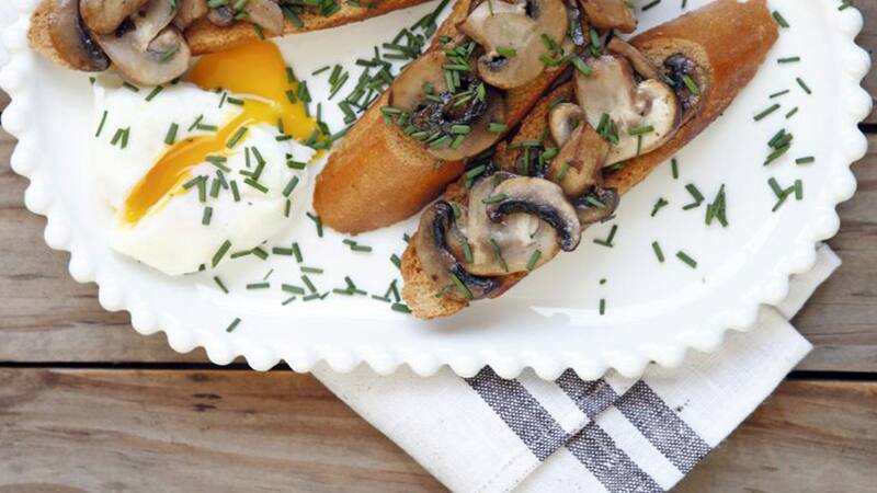 4. Poner sobre las tostadas de pan los champiñones y finalmente el huevo pochado. Decorar con ciboulette.