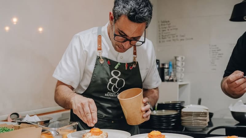 Aquí la experiencia tiene nombre propio y una raíz clara: la cocina palestina. Liderado por el chef Jad Alarja, Ochomil organiza cenas de autor, generalmente de cinco tiempos, donde los platos dialogan con la memoria, el territorio y la tradición.