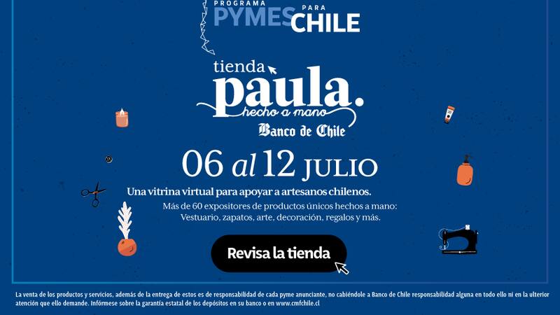 Desde el 6 hasta el 12 de julio Banco de Chile te invita a comprar en Tienda Paula Hecho a Mano, una selección de algunos de los mejores productos de más de 60 emprendedores nacionales.