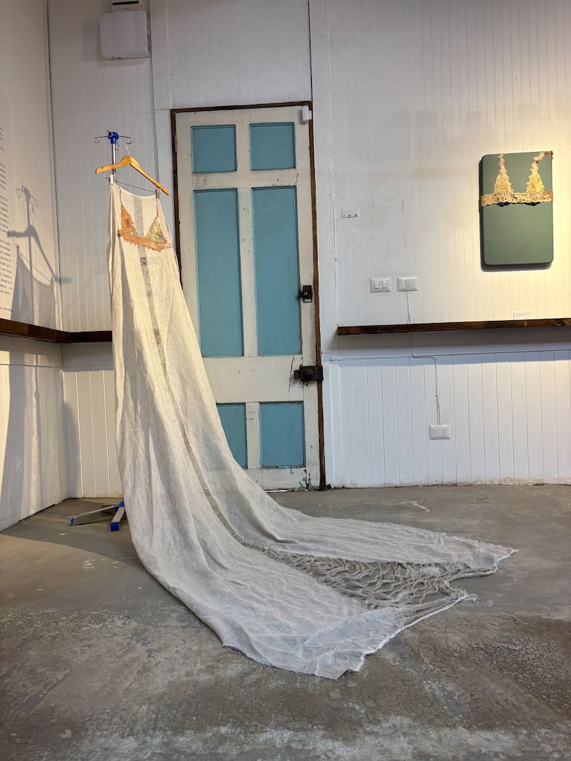 Con el tiempo, esa pieza se rompió, así que decidió bordarla sobre lino y colgarla de un soporte de suero, como los que se usan en las quimioterapias. “Ahí se cerró el círculo. Esa obra se terminó recién este año, cuatro años después. Sentí que se completaba todo: la pintura, el cuerpo, la memoria y la vida”.