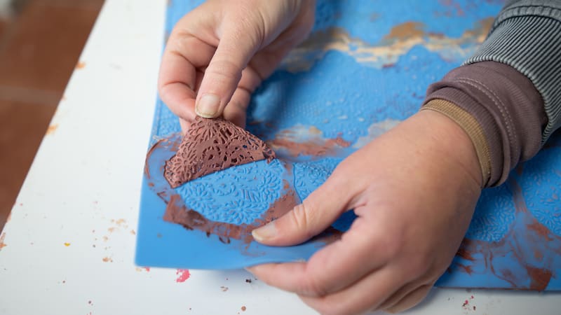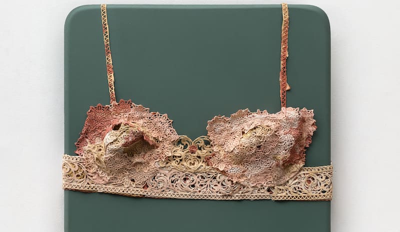 Probó con moldes de encaje, inspirada en los stencils florales que solía usar, hasta descubrir que en la repostería existían moldes de silicona para hacer encajes de azúcar. “Mandé a pedir varios por internet y comencé a aplicar capas de pintura sobre ellos. La pintura se secaba, la despegaba, y quedaba una pieza completamente hecha de pintura, sin tela”. De ese proceso nació su primera obra: Mastectomía, un sostén construido únicamente con pintura. “Era, en realidad, un autorretrato. Usé tonos piel, pero también verdes y amarillos, los colores de los moretones que me quedaban en el cuerpo. Me daba pudor mostrarlo. Lo dejé colgado en mi taller”.