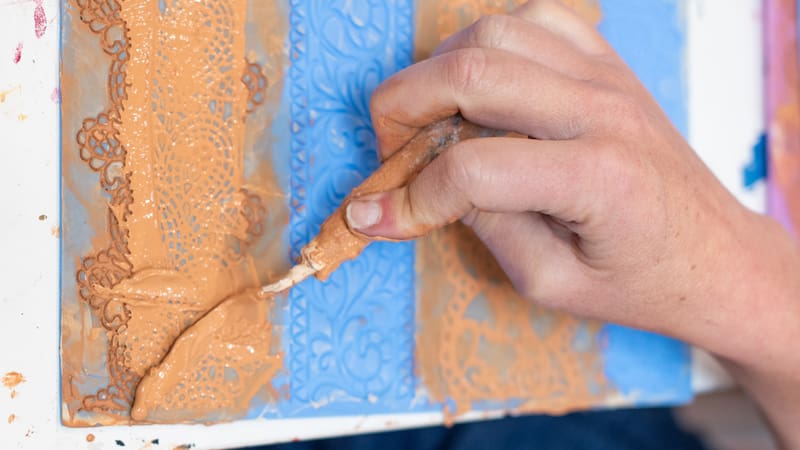 En esos días de encierro y tratamientos, Ingrid comenzó a pintar con acrílico, un material que no usaba hace años, y descubrió algo inesperado. “El óleo no podía usarlo porque mi hijo era chico y el olor era muy fuerte. Así que empecé a trabajar con acrílico y me di cuenta de que, al secarse, se formaban unas costras duras”, recuerda.