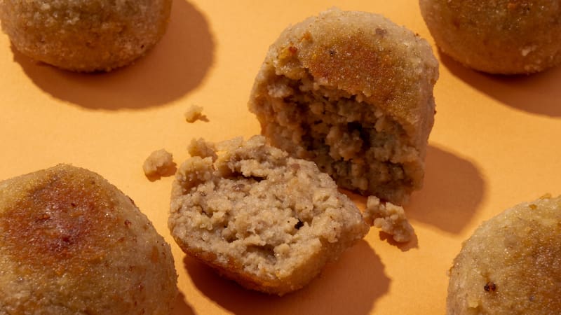 8. Cocinar las albóndigas en un sartén tapado, con una fina capa de aceite de oliva extra virgen, a fuego medio, removiendo ocasionalmente hasta dorar por todos sus lados. Alternativamente, hornear en horno precalentado a 180°C durante 5 a 7 minutos, o hasta que estén levemente doradas.