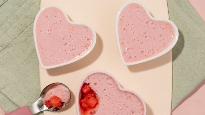 7. En un vasito o pote pequeño, disponer la base de frutillas cocidas y cubrir con la mezcla anterior. Refrigerar por un mínimo de 4 horas o hasta que la preparación esté firme.