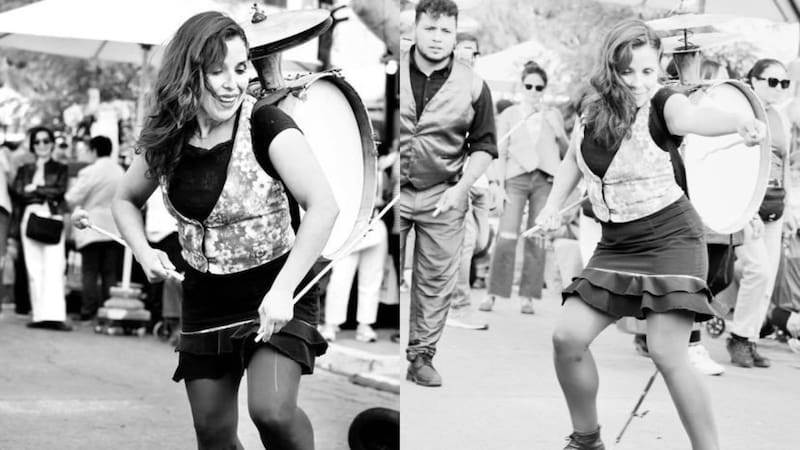 En ese mismo recorrido llegó al oficio de chinchinera. Entrar ahí no fue solo aprender un instrumento, sino aprender a moverse en un territorio donde la legitimidad no siempre se concede con facilidad. El chinchín se carga en el cuerpo y se toca en la calle. Es un oficio históricamente masculino, aprendido en la práctica y sostenido en el tiempo. Para Paulina, ser chinchinera implicó permanecer: volver una y otra vez, ocupar el espacio y sostener el oficio.