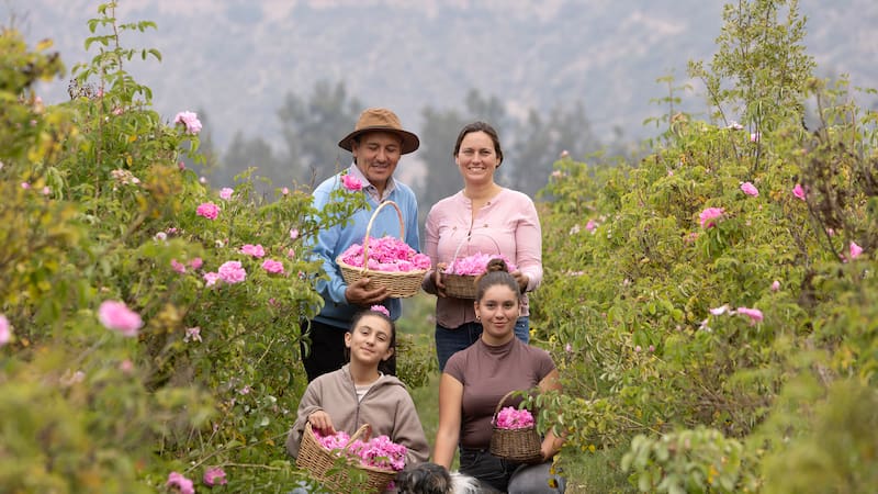 Esa misma tarde tomó un bus y al día siguiente ya estaba en Kazanlak, una región conocida por sus extensos campos de rosa damascena. “Es como camino a la costa, cuando pasas el túnel y aparecen las viñas, pero allá eran rosas. Rosas por todos lados”, dice. Quedó tan impresionado que decidió volver cuatro años seguidos, visitó el Museo de la Rosa y se dedicó a entender cada parte del proceso. “Me cerraron las puertas muchas veces, pero yo insistía. Tenía claro que quería traer ese proyecto a Chile, no solo el aceite, sino el conocimiento completo: cómo se cultiva, cómo se extrae, todo”.