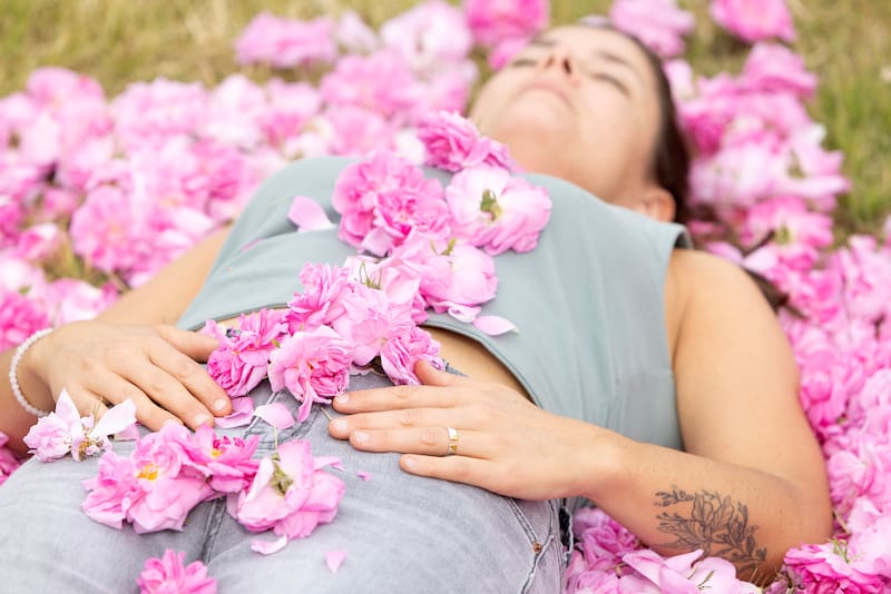 En cada círculo, las asistentes cosechan juntas, se sientan sobre los pétalos y acompañan con la mirada, el oído, el cuerpo presente. “A veces hablamos, a veces no. A veces salen cantos. Una vez, con un grupo de brasileñas, hicimos todo en silencio. Fue hermoso”. En uno de esos encuentros, terminaron haciendo un baño de rosas. “Todas las mujeres sentadas en círculo, rociando pétalos unas a otras. Fue exquisito”.