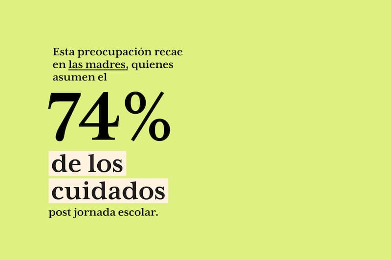 Esta desincronización se vuelve especialmente compleja en hogares monoparentales, en su mayoría, liderados por mujeres. Estos hogares enfrentan una doble carga: cuidar y generar ingresos. “Mientras que el 73,6% de los cuidados post jornada escolar lo asumen las madres, solo el 22,7% corresponde a los padres. Para las mujeres esto genera gran tensión en la conciliación entre el trabajo y la vida personal, y dificulta su participación laboral, además de producir sentimiento de culpa y frustración”, explica Del Villar.