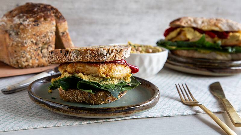 4. Armar el sándwich, poner en la base las hojas de espinaca, una capa generosa de humus, sobre éstas el pollo y terminar con el pimentón acaramelado. Tapar y disfrutar.